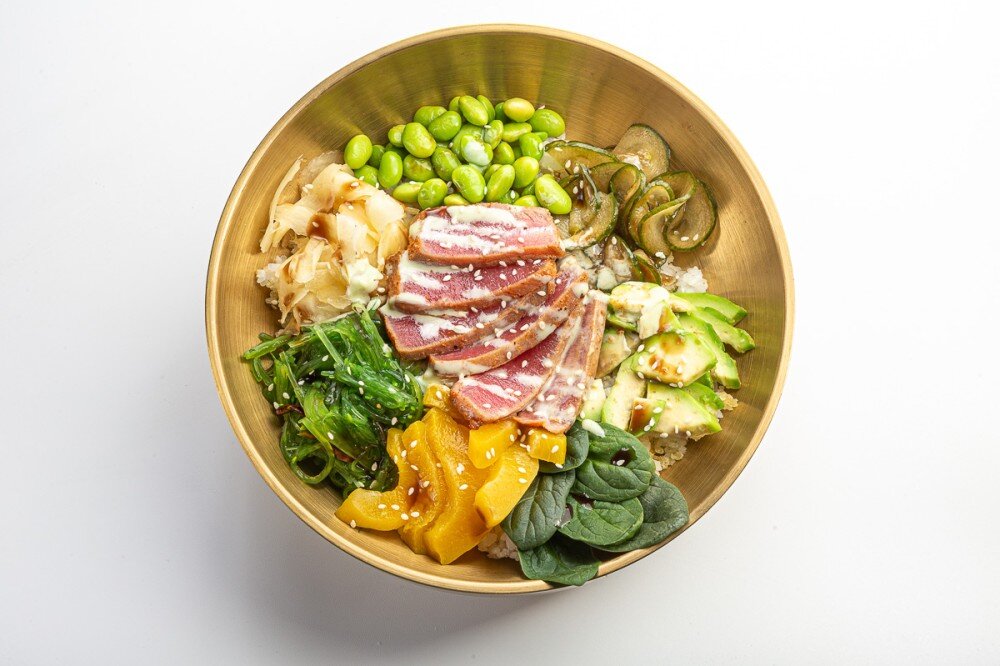 Рис, тунец, маринованный имбирь, салат Чука, авокадо, персик, шпинат, бобы эдамаме, маринованный огурец, соус Ореховый, соус Унаги, соус Васаби, кунжут, стружка темпура