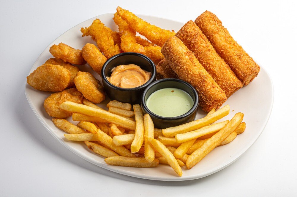 Картофель фри 150 грамм, наггетсы 5 шт, креветки темпура 5 шт, сырные палочки 4 шт 260 – грамм