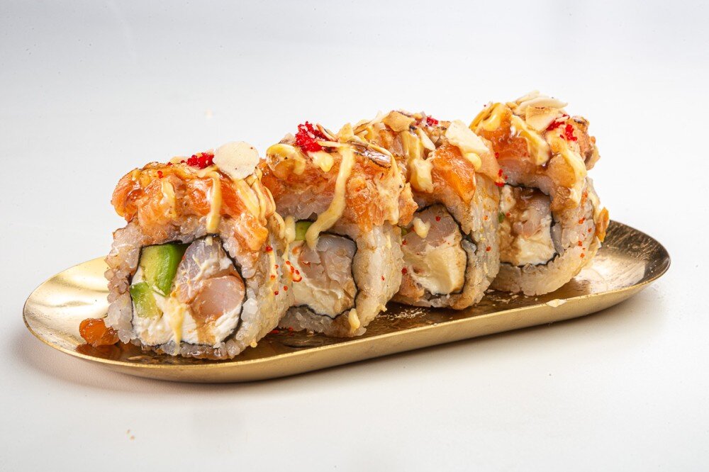 Рис, нори, сливочный сыр, тигровая креветка, лосось, огурец, соус Спайси, соус Унаги, лепестки миндаля