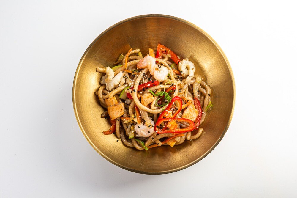 Морское ассорти из кальмара, креветки и лосося с лапшой удон.