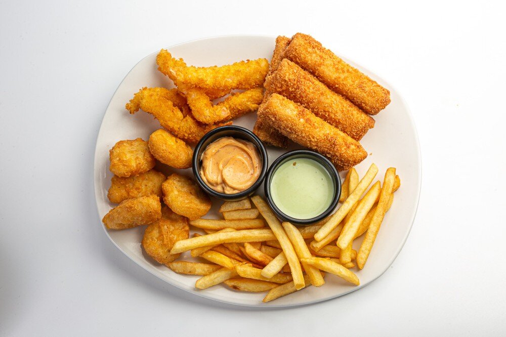Набор для компании: картофель фри, куриные наггетсы, креветки темпура и сырные палочки.