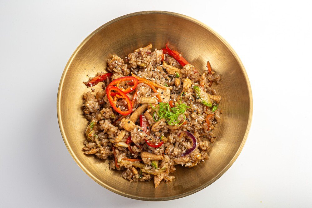Японский вариант жареного риса с курицей, овощами и соевым соусом.