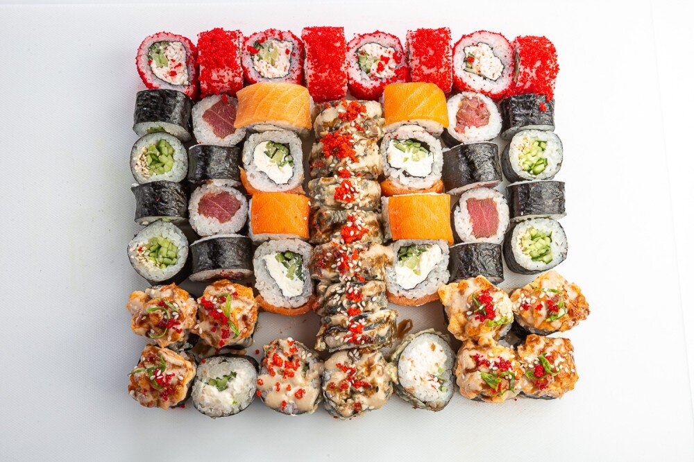 Запеченный ролл сырный лосось Фидельфия лайт Маки ролл с огурцом Маки ролл с тунцом Калифорния с крабом Жареный ролл со снежным крабом