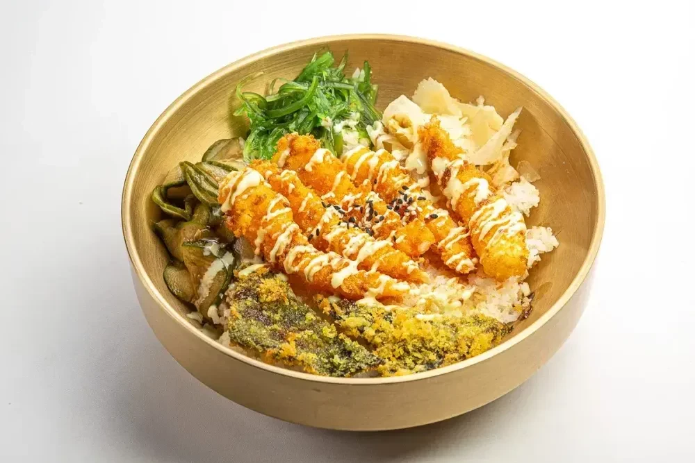 Тигровые креветки жареные в темпуре, подаются на рисе с пикантными маринованными оурчиками, салатом чука, имбирем маринованным, нори темпура, соусом васаби, соусом унаги, кунжутом. 220 гр